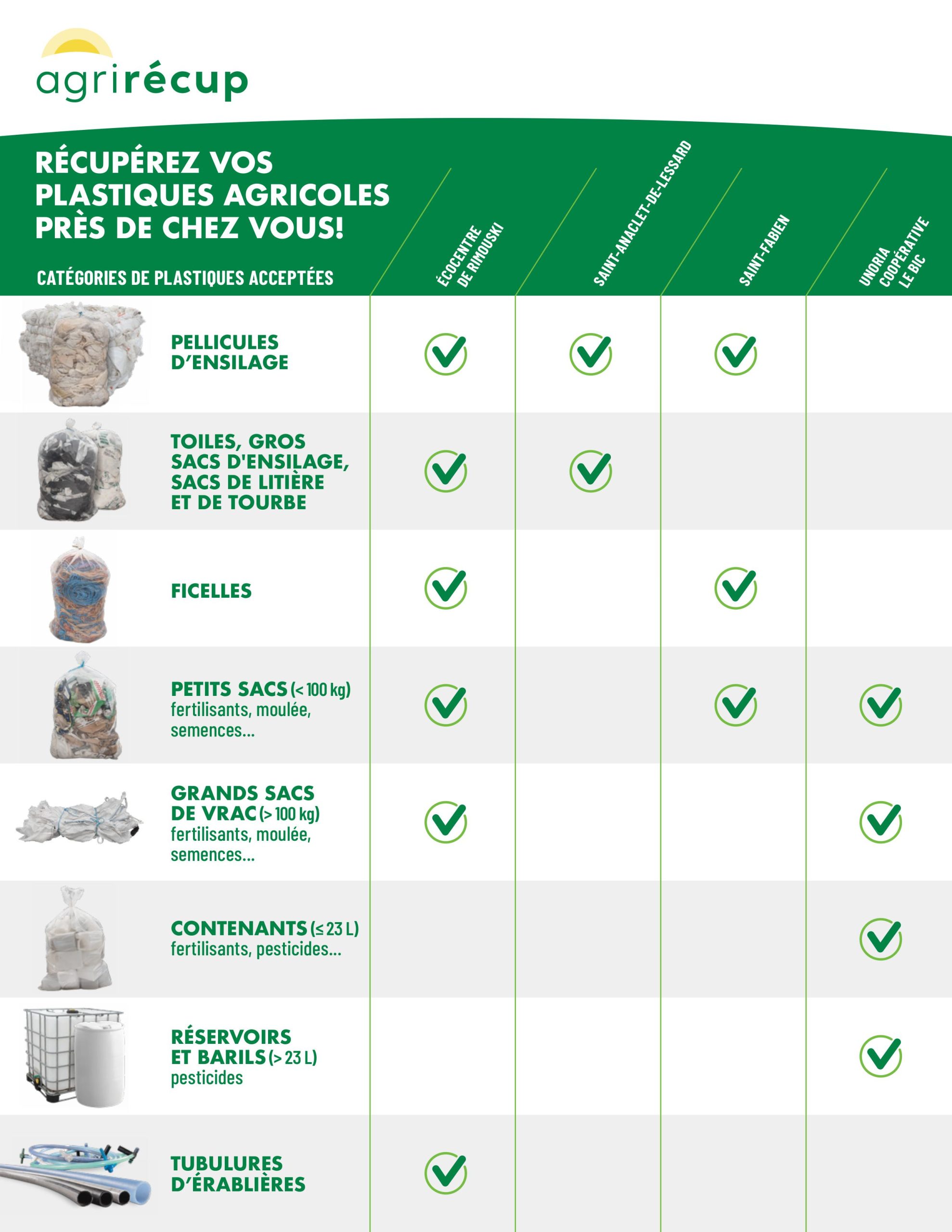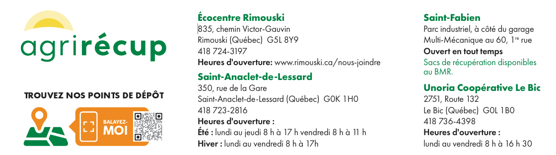 Depuis l’entrée en vigueur des nouvelles réglementations provinciales, les plastiques agricoles sont assujettis à la Responsabilité élargie des producteurs (REP). Ils doivent être obligatoirement apportés dans les points de dépôt d’AgriRÉCUP, et ne peuvent plus être mis au bac de récupération. AgriRÉCUP est l’organisme à but non lucratif désigné par le gouvernement pour mettre en place ce nouveau système de collecte et traitement des plastiques agricoles visant à améliorer la qualité du tri et à développer des débouchés locaux pour cette matière.